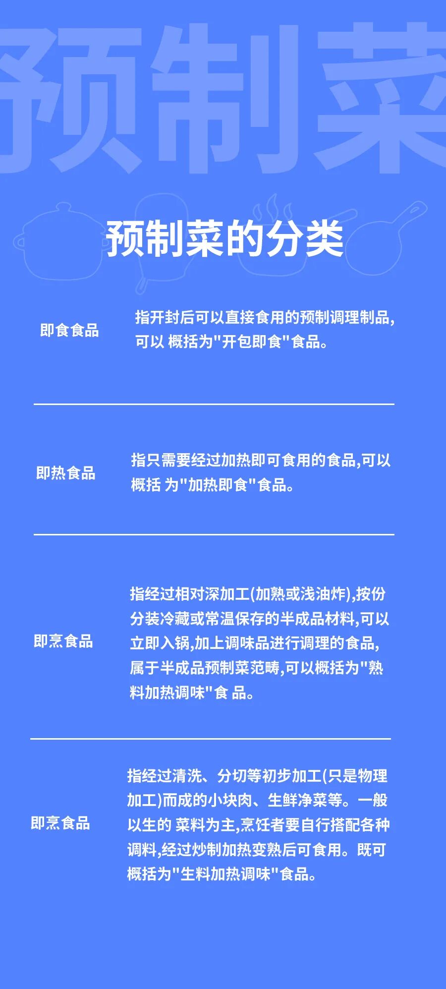 「预制菜」,是预先制作出来的菜品,又称半成品,以农、畜、禽、水产为原料,配以各种辅料,在中央厨房经过预加工(搅拌、腌制、分切、调味等)而成。主要有即食、即热、即烹、即配四大类别。